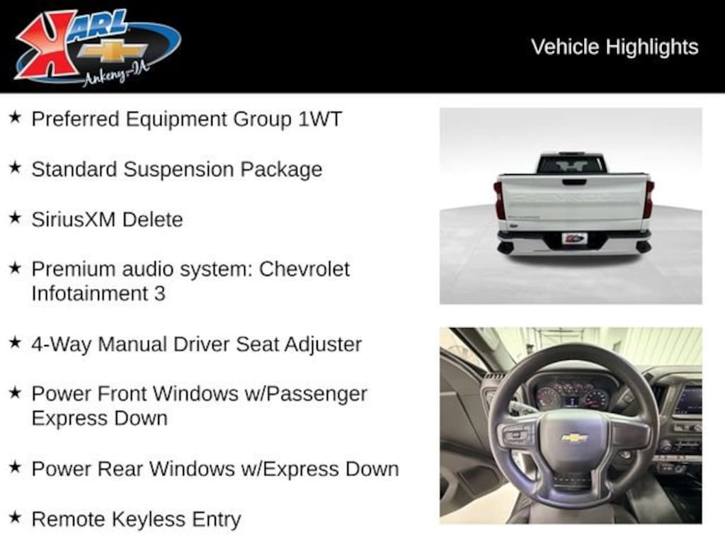 At Karl Chevrolet we want to help you find the best new or used car in Ankeny that suits your needs. When you buy a new car at Karl Chevrolet you know you're finding a vehicle you can rely on. We have a great selection of Platinum Quality Pre-Owned Vehicles. We also pride ourselves in creating a friendly atmosphere and a reliable Dealership that you can trust. Call us and our experts will be glad to help you! (515) 299-4300. *Equipment and options are generated by a 3rd party vendor, exact vehicle options may vary. Please see a salesperson for complete details and vehicle information.