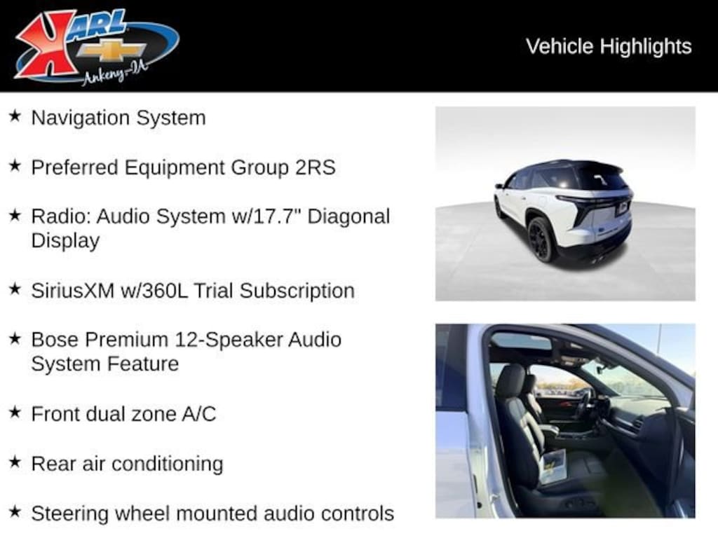 At Karl Chevrolet we want to help you find the best new or used car in Ankeny that suits your needs. Check out the 2025 Chevrolet Traverse For Sale in Ankeny, IA. When you buy a new car at Karl Chevrolet you know you're finding a vehicle you can rely on. We have a great selection of Platinum Quality Pre-Owned Vehicles. We also pride ourselves in creating a friendly atmosphere and reliable new car dealership that you can trust. Call us with any questions about our 2025 Chevrolet Traverse and our experts will be glad to help you! (515) 299-4300. *Equipment and options are generated by a 3rd party vendor, exact vehicle options may vary. Please see a salesperson for complete details and vehicle information.