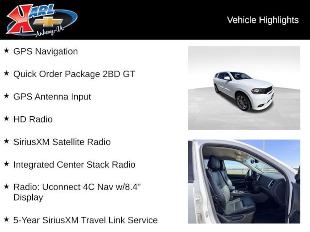 Don't miss your chance to experience the exceptional quality and value of this 2020 Dodge Durango GT GT AWD. Visit Karl Chevrolet of Ankeny today and let our team of experts help you find the perfect vehicle to meet your needs.