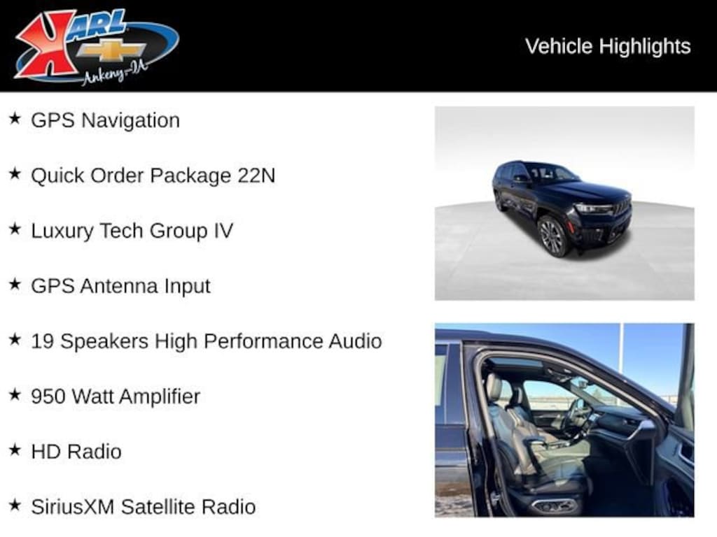 This 2021 Jeep Grand Cherokee L Overland 4x4 is now available at Karl Chevrolet of Ankeny, the Nation's #1 CarBravo Certified Dealer. Our team of experts is dedicated to providing you with a seamless and stress-free car-buying experience, and we're confident that this exceptional SUV will exceed your expectations. Visit us today to schedule a test drive and discover the true power and versatility of the Jeep Grand Cherokee L.