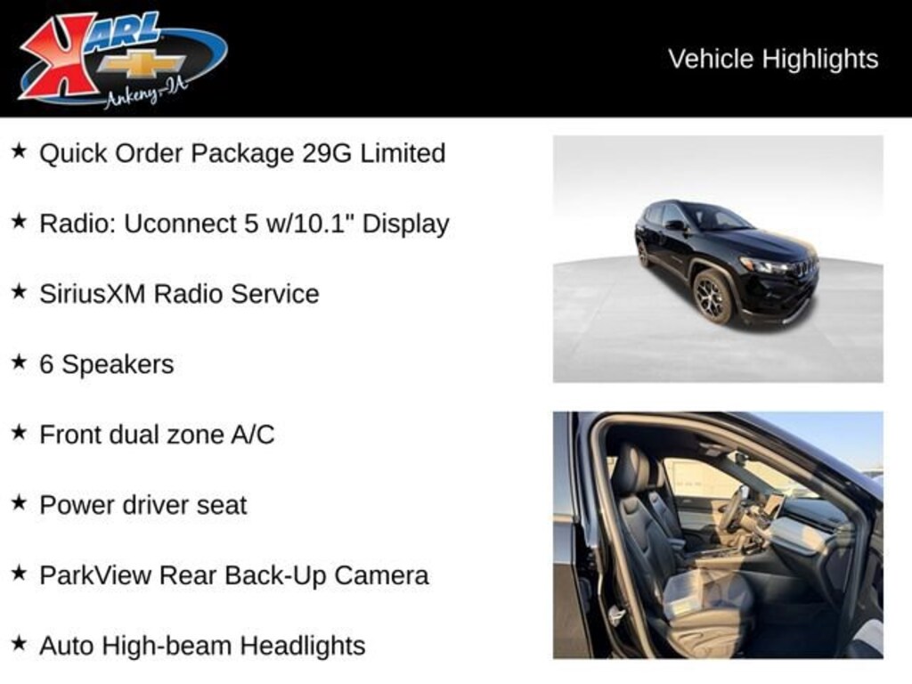 At Karl Chevrolet we want to help you find the best new or used car in Ankeny that suits your needs. Check out the 2024 Jeep Compass For Sale in Ankeny, IA. When you buy a new car at Karl Chevrolet you know you're finding a vehicle you can rely on. We have a great selection of Platinum Quality Pre-Owned Vehicles. We also pride ourselves in creating a friendly atmosphere and reliable new car dealership that you can trust. Call us with any questions about our 2024 Jeep Compass and our experts will be glad to help you! (515) 299-4300. *Equipment and options are generated by a 3rd party vendor, exact vehicle options may vary. Please see a salesperson for complete details and vehicle information.