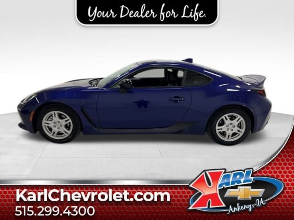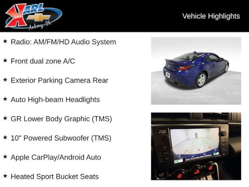 Certification Program Details: Karl Chevrolet of Ankeny, The Nation's #1 CarBravo Certified Dealer! Every CarBravo Certified vehicle includes: Comprehensive 126-Point Inspection Professionally inspected by factory-trained technicians to meet strict mechanical, safety, and cosmetic standards. 12-Month / 12,000-Mile Bumper-to-Bumper Limited Warranty Enjoy added peace of mind with extensive coverage from the day you drive off the lot. 24/7 Roadside Assistance & Courtesy Transportation Flat tire? Dead battery? Need a tow? You're covered anywhere, anytime throughout the warranty period. Vehicle History & Title Guarantee Clean title, completed safety recalls, and a full CARFAX® or AutoCheck® report provided for complete transparency. 10-Day / 500-Mile Exchange Promise If you don't absolutely love it, bring it back and exchange it no hassle, no stress. Experience peace of mind and premium protection exclusively from Karl Chevrolet of Ankeny, the Nation's #1 CarBravo Dealer! 2.4L I4 DOHC 6-Speed Automatic ECT-i RWD Radio: AM/FM/HD Audio System Front dual zone A/C Exterior Parking Camera Rear Auto High-beam Headlights GR Lower Body Graphic (TMS) 10 Powered Subwoofer (TMS) Apple CarPlay/Android Auto Heated Sport Bucket Seats Wheels: 7.5 x 18 Twin 10-Spoke Matte Black AlloyThis 2023 Toyota GR86 Premium PREMIUM AUTO is a true driver's delight. With its powerful 2.4L I4 DOHC engine and smooth 6-speed automatic transmission, this rear-wheel-drive sports car delivers an exhilarating driving experience. The stunning blue exterior is complemented by a wealth of premium features, including dual-zone climate control, a premium audio system, and heated sport bucket seats.Slip behind the wheel and you'll be captivated by the GR86's responsive handling and precise steering, making every drive an adventure. The GR86's low center of gravity and lightweight design provide a thrilling and engaging driving experience, whether you're carving through winding roads or simply commuting to work.Beyond its dynamic performance, the GR86 Premium PREMIUM AUTO offers an impressive array of advanced technologies and convenience features. Enjoy the convenience of Apple CarPlay and Android Auto, as well as the added security of features like the rear parking camera and auto high-beam headlights.This GR86 Premium PREMIUM AUTO is a true gem, offering the perfect blend of style, performance, and technology. With its low mileage and comprehensive CarBravo Certified warranty, this vehicle is sure to provide years of driving enjoyment. Don't miss your chance to experience the thrill of the GR86 schedule a test drive today!At Karl Chevrolet we want to help you find the best new or used car in Ankeny that suits your needs. When you buy a new car at Karl Chevrolet you know you're finding a vehicle you can rely on. We have a great selection of Platinum Quality Pre-Owned Vehicles. We also pride ourselves in creating a friendly atmosphere and a reliable Dealership that you can trust. Call us and our experts will be glad to help you! (515) 299-4300. *Equipment and options are generated by a 3rd party vendor, exact vehicle options may vary. Please see a salesperson for complete details and vehicle information.